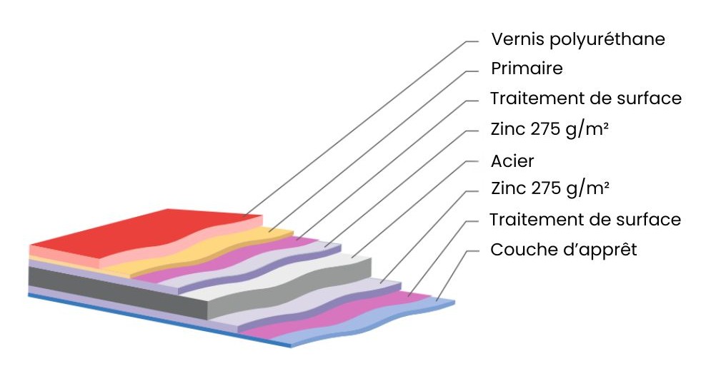 - 8 teintes mates (RAL 6020 - Vert Mat, RAL 7024 - Gris graphite mat, RAL 8017 - Marron mat, RAL 8019 Brun gris mat, RAL 9005 - Noir Mat, RAL 3009 - Rouge Mat, RAL 7016 - Gris Anthracite Mat, RAL 8004 - Terre Cuite Mat). Ce type de tôle offre un aspect légèrement granuleux, pour un effet mat très moderne ;